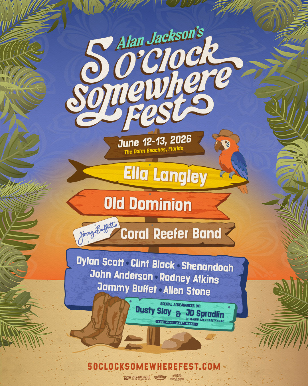 Spend the day on the beach with Alan Jackson's 5 O'Clock Somewhere Fest in West Palm Beach, June 12-13, featuring Ella Langley, Old Dominion, Jimmy Buffett's Coral Reefer Band, and many more. Get off the clock with a drink in your hand.